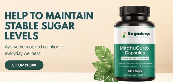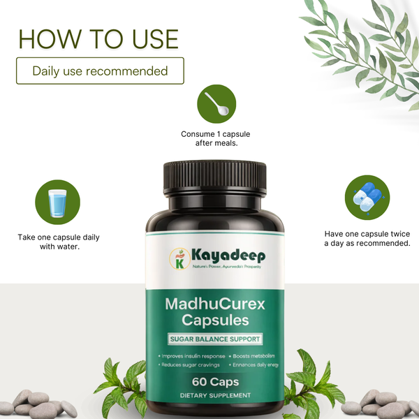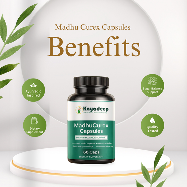 MadhuCurex Capsules by Kayadeep are designed for individuals seeking a convenient and natural way to manage blood sugar levels. Rooted in Ayurvedic wisdom, this formulation supports the body’s metabolic system and promotes sustained energy throughout the day. Regular use, along with a healthy diet and active routine, helps support overall metabolic wellness without artificial additives.